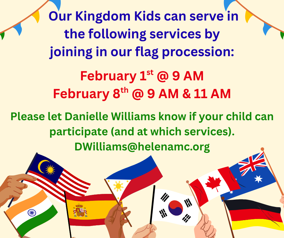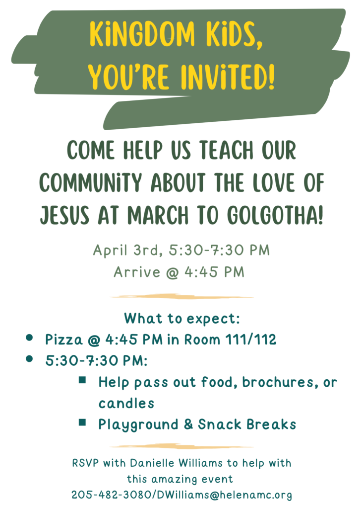 Children Kingdom Kids Jesus said, "Let the little children come to me, and do not hinder them, for the kingdom of heaven belongs to such as these."Matthew 19:14 If you have any questions, please don't hesitate to reach out! Email Danielle Williams at DWilliams@helenamc.org